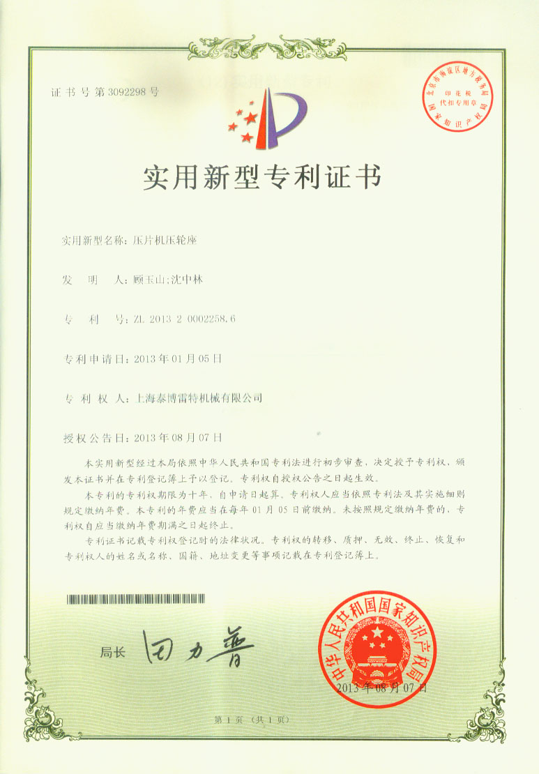 本實(shí)用新型涉及一種壓片機(jī),具體的說一種壓片機(jī)壓輪座,包括壓輪座主體,其特征在于:壓輪座主體包括底座,以及設(shè)置在底座上的左擋板,還包括設(shè)置在底座上的右擋板,壓輪座主體的底座、左擋板及右擋板為一體成型呈U形結(jié)構(gòu),還包括設(shè)置在壓輪座主體U形開口內(nèi)的壓輪,還包括一根壓輪軸,壓輪軸依次貫穿左擋板、壓輪及右擋板,壓輪軸的一端部分外露于左擋板并通過壓輪軸調(diào)節(jié)裝置進(jìn)行固定連接,還包括一根偏心軸,偏心軸經(jīng)壓輪軸調(diào)節(jié)裝置插入于壓輪軸內(nèi)。本實(shí)用新型同現(xiàn)有技術(shù)相比,壓輪可以獨(dú)立加工,同過壓輪座確保壓輪加工時的同心度與平行度、且安裝方便穩(wěn)定。壓輪座采用U形一體結(jié)構(gòu)且強(qiáng)度更可靠,并同時保障了加工精度。