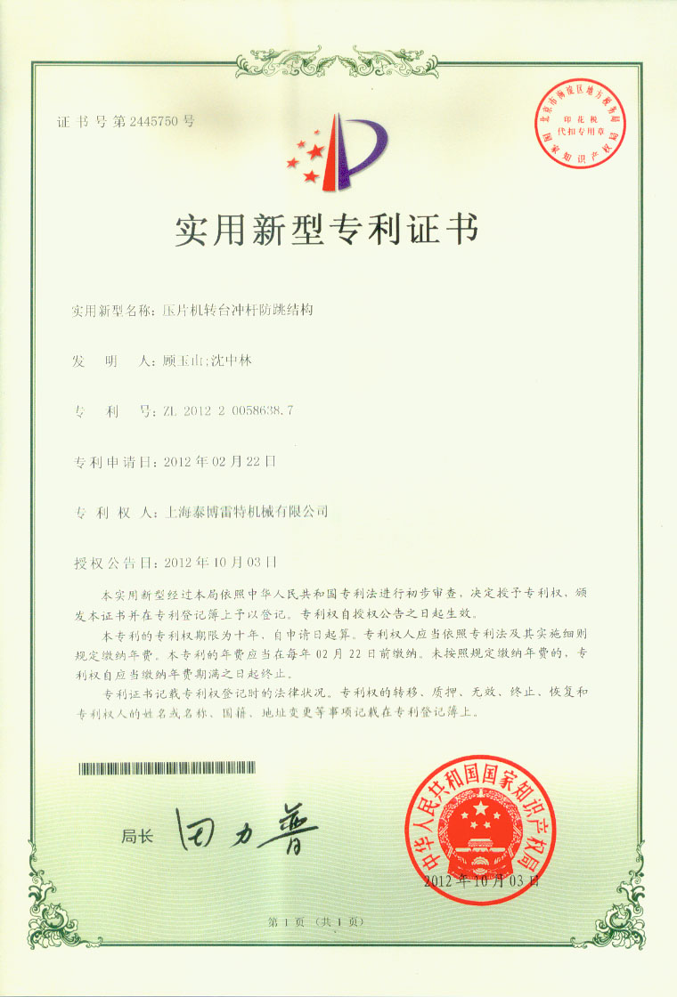 上海泰博雷特壓片機(jī)轉(zhuǎn)臺(tái)沖桿防跳結(jié)構(gòu)專利